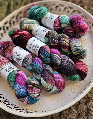 Spell est son opposé, tout en douceur, tout en rondeur. C'est la magie bienveillante et chaleureuse. Mais attention, ce n'est pas un coloris neutre! Il vibre de speckles multicolores et de touches d'acajou profond. Comme les années précédentes en Octobre, j'ai été inspirée par un morceau de musique: "Castin' My Spell" de Johnny Otis et Marcy Lee.